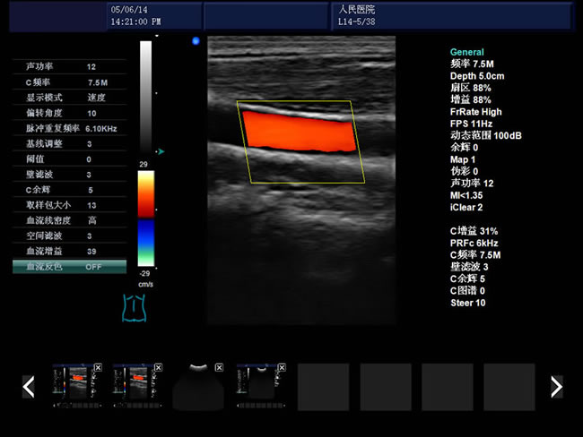 彩色血流圖像調節參數:多普勒頻率、取樣框位置和大小、基線、彩色增益、偏轉角度、壁濾波、累積次數等。