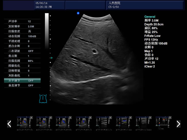 頻率、幀頻、B模式總增益、C模式總增益、D模式總增益、菜單、注釋、灰階帶、穿刺引導線、PRF、壁濾波、血流相關、累積次數、TI熱指數、MI機械指數